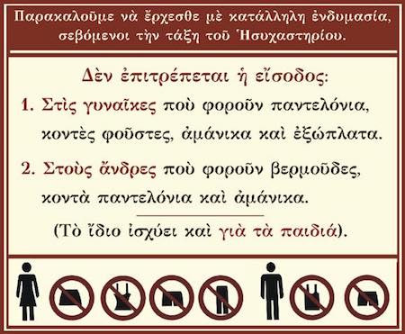 Entry to the Monastery is not allowed to women wearing trousers, short skirts or pareo, and sleeveless or backless dresses.