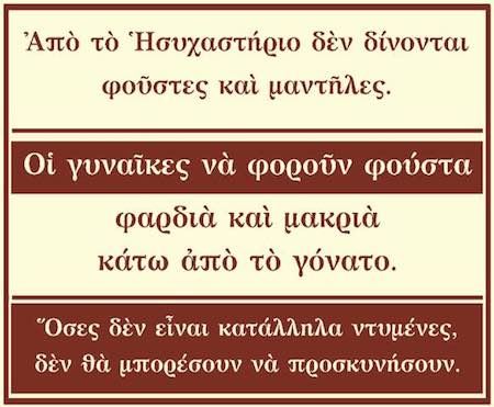 Οι γυναίκες να φορούν φούστα (ή φόρεμα) φαρδιά και μακριά (όχι παρεό - φουλάρι), κάτω από το γόνατο. Το μοναστήρι δεν δίνει φούστες, μαντήλια ή οτιδήποτε άλλο.